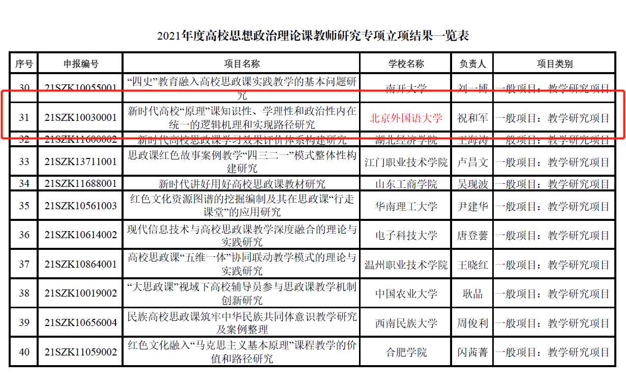 课题立项:北外beat365手机版官方网站祝和军副教授获2021年度高校思想政治理论课教师研究专项资助