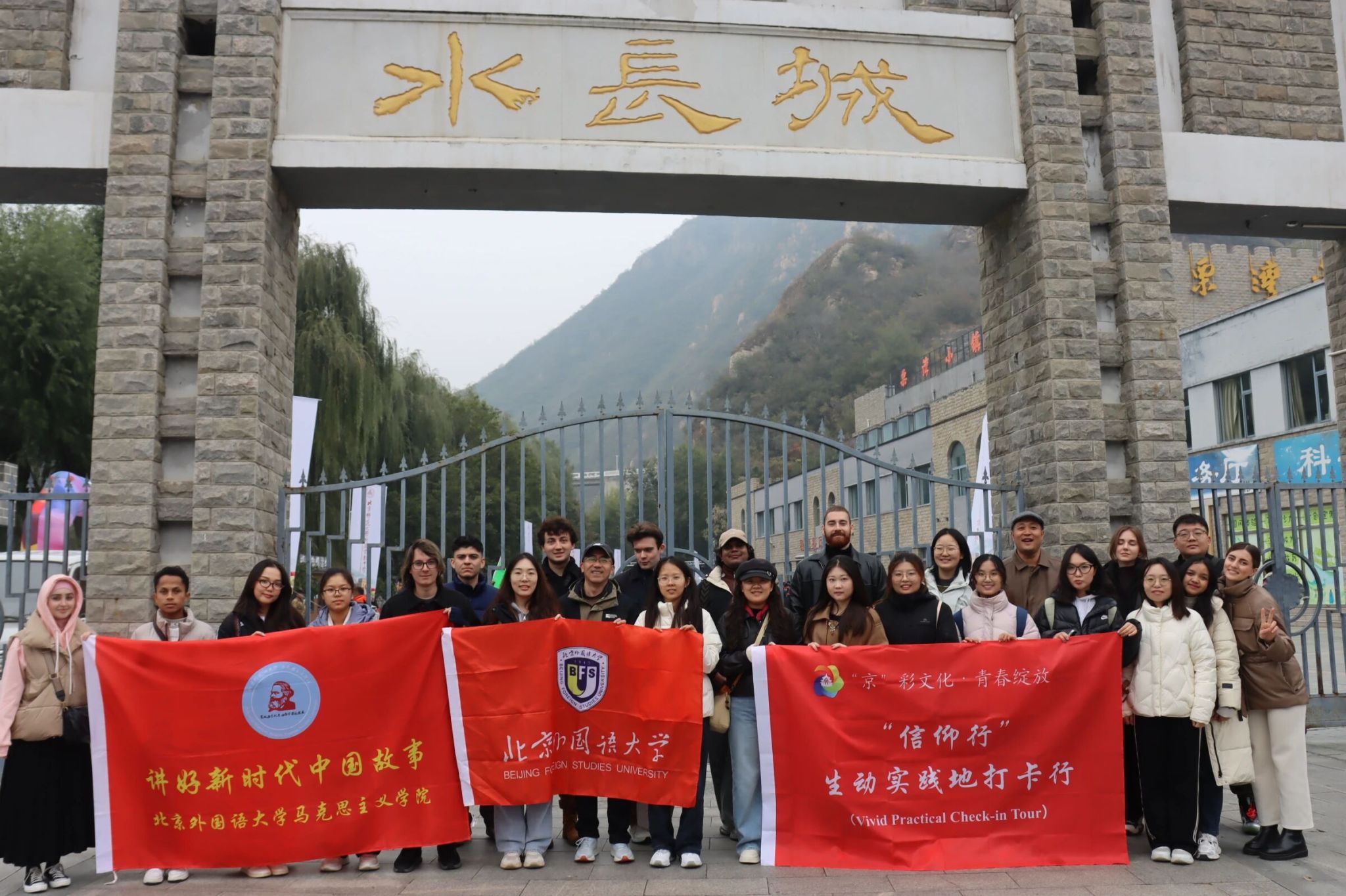 为深入学习贯彻习近平新时代中国特色社会主义思想,引导国际青年深刻感悟中华优秀传统文化的时代价值,beat365手机版官方网站联合留学生办公室精心策划开展“‘京’彩文化 • 青春绽放”主题实践活动。本次活动以“从北京长城看全球——从‘历史脉络’到‘全球坐标’”为主线,组织来自国中院、国关学院两个学院的法国、俄罗斯、巴西、伊拉克、蒙古国、斯洛伐克、哥斯达黎加、马达加斯加、斯里兰卡等9个国家的13名留学生代表以及来自beat365手机版官方网站、高翻学院、国关学院的12名北外学子共赴怀柔区黄花城水长城与响水湖长城景区,开启了一场富有深刻教育意义和时代内涵的实践研学之旅。