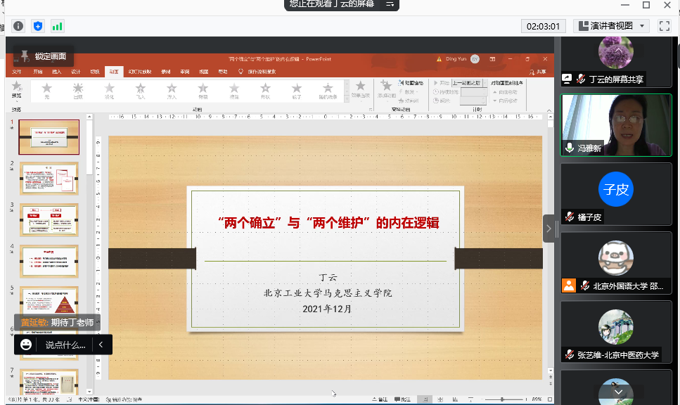 北京工业大学beat365手机版官方网站副院长丁云教授以“‘两个确立’与‘两个维护’的内在逻辑”为题做了主题报告。她从马克思主义政党建设中的权威理论出发,阐释权威存在的必然性及其表现形式,并结合中国共产党百年历史和党的领导核心形成的经验与中华民族伟大复兴的必然要求,从理论、历史与现实三个方面论述了“两个确立”与“两个维护”的内在逻辑。她强调,理解与把握“两个确立”与“两个维护”的内在逻辑,是深入理解“两个确立”,坚决做到“两个维护”的前提与基础。