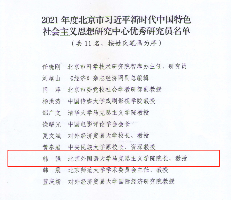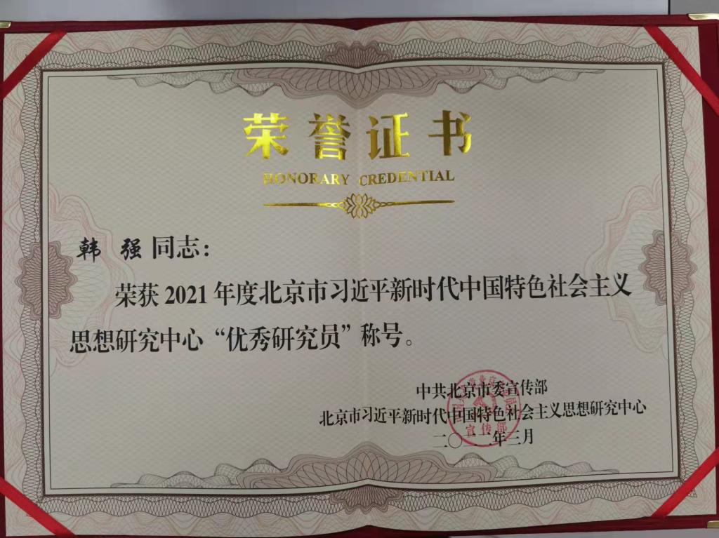 3月24日,北京市习近平新时代中国特色社会主义思想研究中心召开2021年工作总结暨2022年工作部署会,会议通报了2021年度北京市习近平新时代中国特色社会主义思想研究中心研究基地工作情况,并评选了2021年度北京市习近平新时代中国特色社会主义思想研究中心优秀研究员、优秀工作者和优秀研究基地,beat365官网韩强教授获评2021年度北京市习近平新时代中国特色社会主义思想研究中心优秀研究员。
