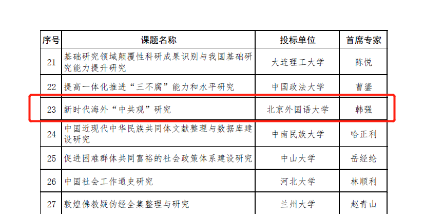 20221229日,教育部办公厅发布《关于2022年度教育部哲学社会科学研究重大课题攻关项目立项的通知》(教社科厅函[2022]50号),根据《通知》,2022年度教育部哲学社会科学研究重大课题攻关项目共有51项批准立项,beat365官网韩强教授作为首席专家领衔申报的《新时代海外“中共观”研究》成功获批立项,项目编号:22JZD023