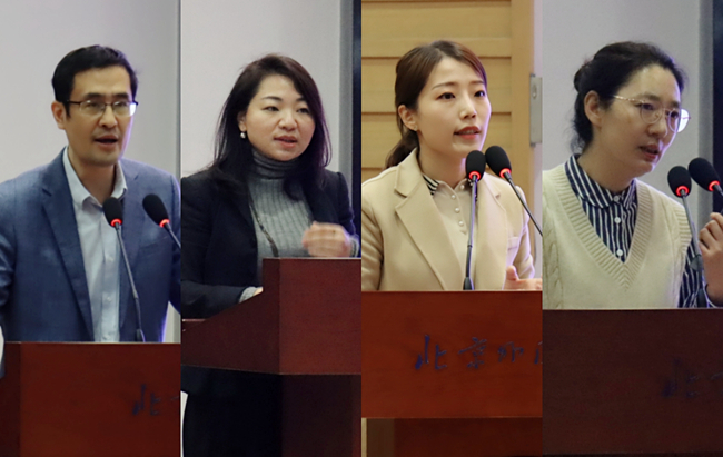 来自中国人民大学beat365手机版官方网站的宋友文教授以及北外beat365手机版官方网站的张曼、刘菁、韩雪青三位教师分别进行了说课展示。宋友文以“如何培养理论思维?——读原著、学原文和悟原理”为题,从什么是理论思维、培养理论思维为何重要、怎样培养理论思维三个方面生动讲述了如何引导学生认清社会发展大势,做到理论上清醒,政治上坚定。张曼以《马克思主义基本原理》第三章第三节《人民群众在历史发展中的作用》的教学为例,围绕人民群众概念辨析、辩证看待人民群众创造历史过程中的作用等问题,展示了从案例导入、理论分析到拓展总结的教学过程。刘菁以《思想道德与法治》课教学中的社会热点为切入点,示范了如何通过社会热点事件和案例来引导学生正确认识中国特色社会主义法治道路和树立法治思维,并展示了自己在丰富思政课教学方法方面所作的尝试。韩雪青以《毛泽东思想和中国特色社会主义理论体系概论》课中“发展社会主义民主政治”为主题,围绕民主是社会主义的生命、坚持走中国特色社会主义政治发展道路、健全人民当家作主制度体系这三个层面展开理论阐释,落脚于坚定对中国特色社会主义政治制度的自信。