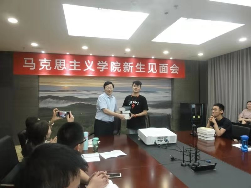 会议最后进行了隆重的赠书活动。林建华院长向全体新生赠送了《马克思恩格斯选集》、《习近平谈治国理政》和《习近平新时代中国特色社会主义思想学习纲要》,鼓励大家读原著、学原文,悟原理。