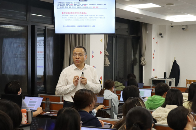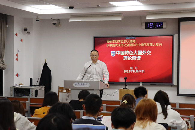 10月30日,beat365手机版官方网站校长、党委副书记杨丹以《中国特色大国外交理论解读》为题,分别为2022级西班牙语葡萄牙语学院、英语学院本科生讲授“形势与政策”课程。
