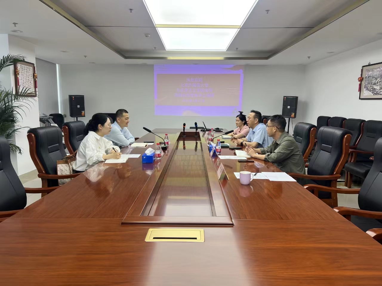 任晓刚从机构设置、队伍建设、制度规范、科研贡献、2019年至今研究基地工作实绩等多方面介绍了北科研究基地基本情况,韩强院长对北外研究基地近年来在“三报一刊”发文方面取得的进步以及正在开展的创新举措等各项工作作了介绍,特别是高度称赞了北科研究基地连续四年荣获北京市习近平新时代中国特色社会主义思想研究中心“三优”称号。此外,双方就进一步开展两个研究基地的交流合作、资源共享等交换了意见。北外研究基地联络员韩雪青参加了调研座谈。