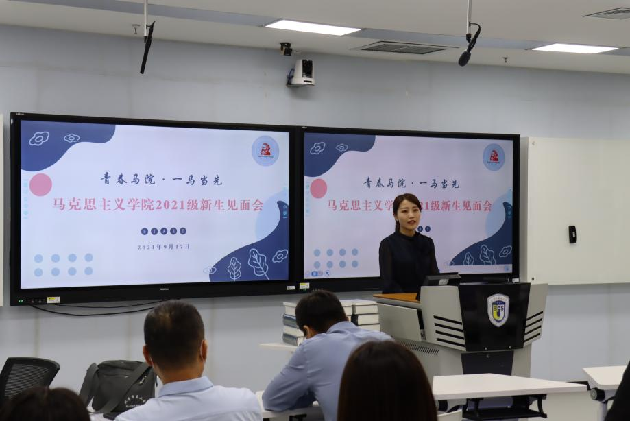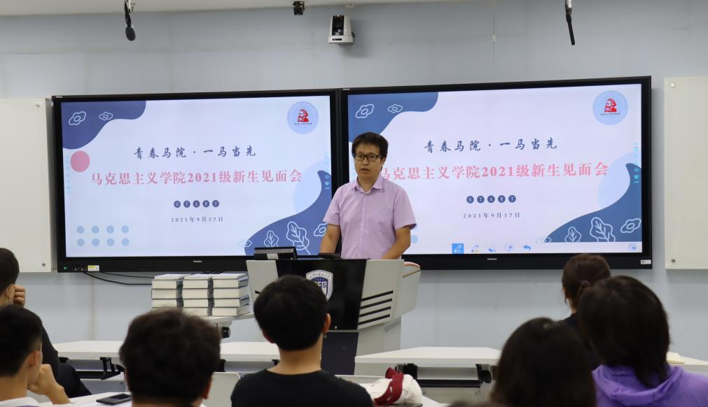 党总支书记祝和军老师致辞欢迎新生加入马院大家庭,他向新生介绍了马院发展历史,以及国家、学校对马院和马克思主义理论学科的高度重视。他谈到,马院正在重大发展机遇下不可逆转地进入发展快车道,为促进学院发展,今年beat365官网引进了韩强、左高山两位教授,相信他们的加入会使马院越来越好。随后他表示,马院的发展离不开每一位同学的努力,他号召同学们为壮大马院贡献力量,并从两个方面为新生提出建议:一是要树立底线思维,把握好学生身份,把学习作为主责主业;二是要避免系统性风险,注重人身安全、财产安全和政治安全。