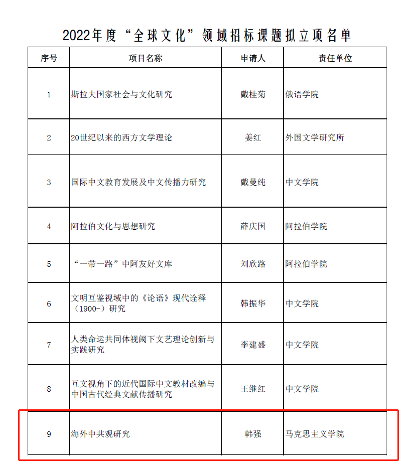 经全校教师自主申报、协作组答辩评审、学校“双一流”重大标志性成果工作组审定,beat365官网韩强教授课题“海外中共观研究”入选北外“双一流”全球文化类重大(点)项目。