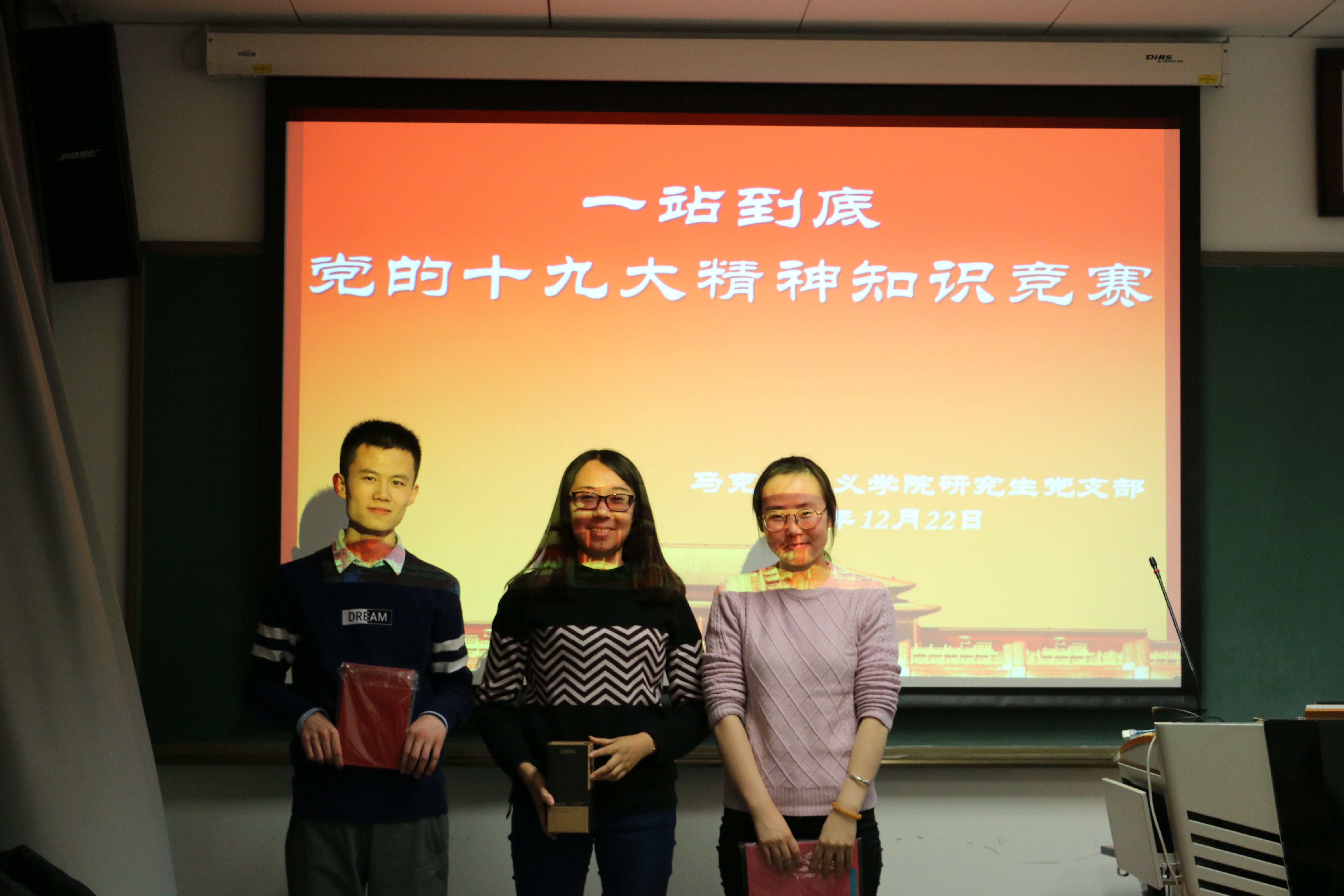 本次知识竞赛以中国共产党的基本理论、十九大报告、以及十九大后形成的党的最新理论成果为内容,通过一站到底式的竞答方式,以淘汰制的赛制,吸引了各位同学的积极踊跃的参与,每一个人在竞答过程中尽其所能,使得整个比赛过程既具娱乐性,也具有很强的学习性。每个人在答题过程中加深了对中国共产党的了解和对十九大精神的领悟。经过激烈的角逐,于慧、付豪、王琼分别获得了一等奖、二等奖和三等奖。