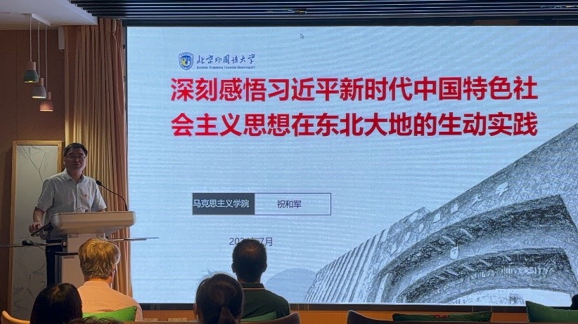 该活动主要围绕庆祝中国共产党成立103周年、学习贯彻习近平经济思想、学习贯彻习近平总书记给北外老教授的回信精神、学习贯彻习近平总书记对学校思政课建设的重要指示精神、暑期实践教学活动集体备课等主题展开。刘珊珊以“中国共产党的百年奋斗历程与马克思主义中国化的理论创新”为题,从历史的角度和脉络,重温了中国共产党的百年奋斗历程,从理论上阐释习近平新时代中国特色社会主义思想是当代中国的马克思主义、21世纪的马克思主义。孙磊以“新质生产力和生态文明建设”为题,回顾了新时代十年习近平总书记在东北地区考察调研的足迹,阐释了东北振兴在国家战略上的重要意义。他从新质生产力和生态文明建设之间的关系入手,详细介绍了习近平总书记提出新质生产力理论的时代背景,深入讲解了新质生产力理论在习近平生态文明思想中的重要地位和作用。鞠慧以“对外讲好中国故事,推动海外出版事业”为题,分享了外研社在学习贯彻习近平总书记给北外老教授的回信精神方面的具体实践。她结合外研社在海外出版传播方面的各项工作,与大家交流了《习近平谈治国理政》、《习近平总书记教育重要论述讲义》等重要著作的多语种翻译出版工作,阐述了对外讲好中国故事的重要性,激发了大家对于文化传播与交流的深刻思考。暑期社会实践团队张池同学结合思政课对她的理论熏陶,交流了学习习近平总书记对学校思政课建设重要指示精神的感想,围绕北外“有家国情怀、有全球视野、有专业本领”的人才培养目标,表达了北外学子新时代新征程上的责任与担当。