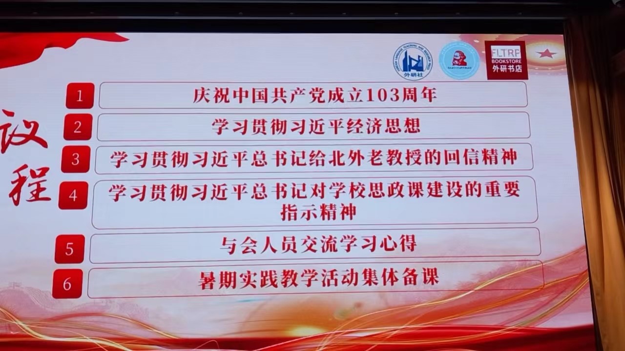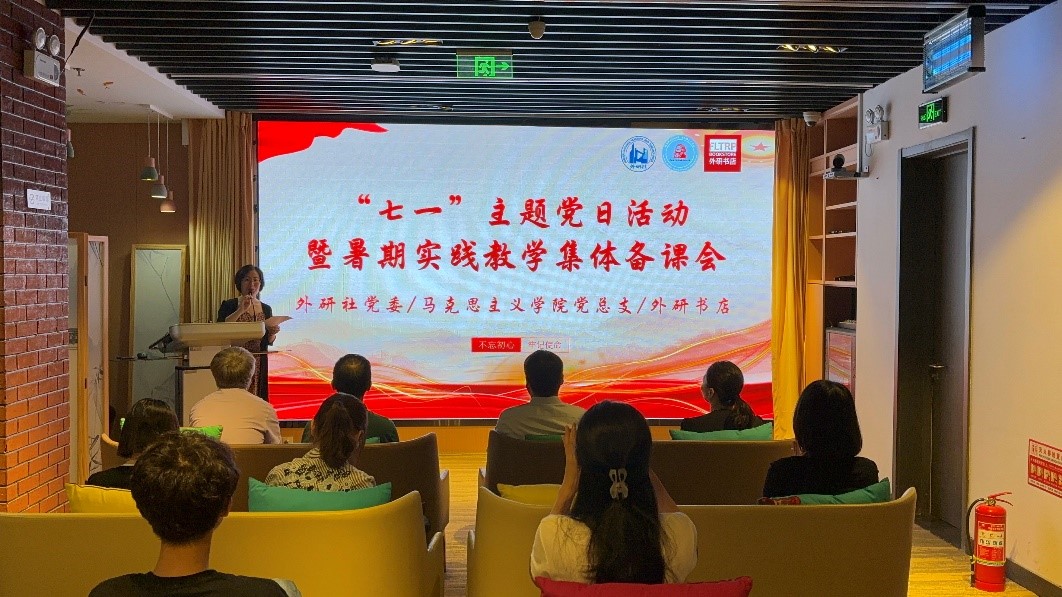 7月1日上午,为庆祝中国共产党成立103周年,深入贯彻落实习近平总书记对学校思政课建设的重要指示精神,外研社党委、beat365手机版官方网站党总支、外研书店联合举办 “七一”主题党日活动暨暑期实践教学集体备课会。beat365手机版官方网站党总支书记祝和军,外语教学与研究出版社中国语言文化出版分社社长鞠慧,beat365手机版官方网站副院长孙磊、beat365手机版官方网站党总支组织员王浩、beat365手机版官方网站团总支书记辅导员刘珊珊出席会议,来自beat365手机版官方网站的部分学生党员以及参加暑期实践教学活动的全体同学参加会议。活动由外研书店店长唐静文主持。